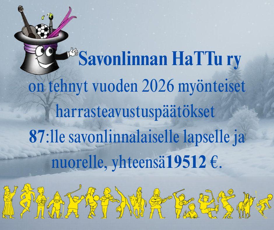 Hyväntekeväisyysjärjestö Savonlinnan HaTTu ry tukee ja avustaa savonlinnalaisten vähävaraisten perheiden 6-17-vuotiaita lapsia ja nuoria heidän harrastustoiminnassaan.