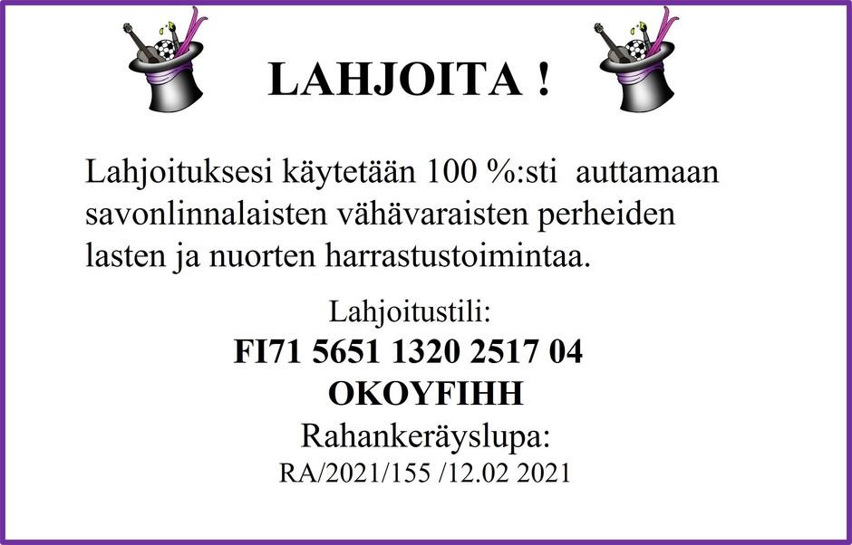 Kaikki kertyneet tulot ohjataan lyhentämättöminä vähävaraisten perheiden lasten ja nuorten harrastusmahdollisuuksien tukemiseen Savonlinnassa.